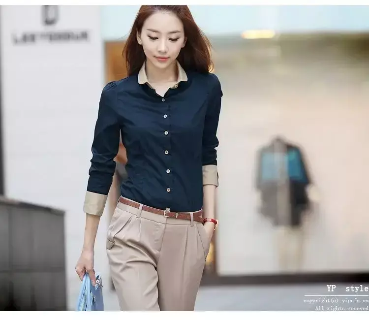 Nova Blusa Elegante Feminina de Primavera com Retalhos em Contraste, Manga Longa, Gola Polo Slim e Versátil